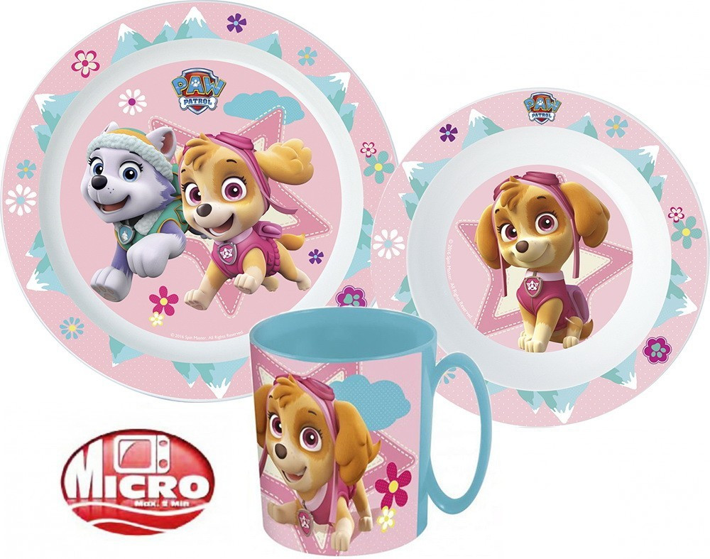 Mancs őrjárat micro gyerek étkészletCsomagolás nélkül!A készlet tartalma:1 db mélytálka (Mikrózható műanyag)1 db lapostányér (Mikrózható műanyag)1 db Micro bögre 350 ml (Mikrózható műanyag)A termék anyaga: műanyag.