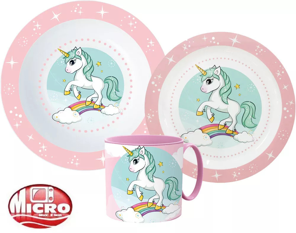Unikornis micro gyerek étkészletCsomagolás nélkül!A készlet tartalma:1 db mélytálka (Mikrózható műanyag)1 db lapostányér (Mikrózható műanyag)1 db Micro bögre 265 ml (Mikrózható műanyag)A termék anyaga: műanyag.