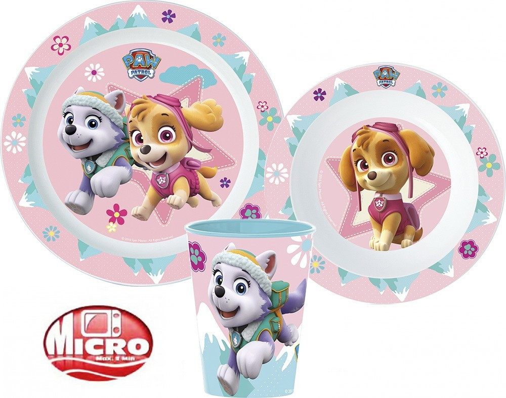 Mancs őrjárat micro gyerek étkészletCsomagolás nélkül!A készlet tartalma:1 db mélytálka (Mikrózható műanyag)1 db lapostányér (Mikrózható műanyag)1 db pohár 260 ml (Nem mikrózható műanyag)A termék anyaga: műanyag.